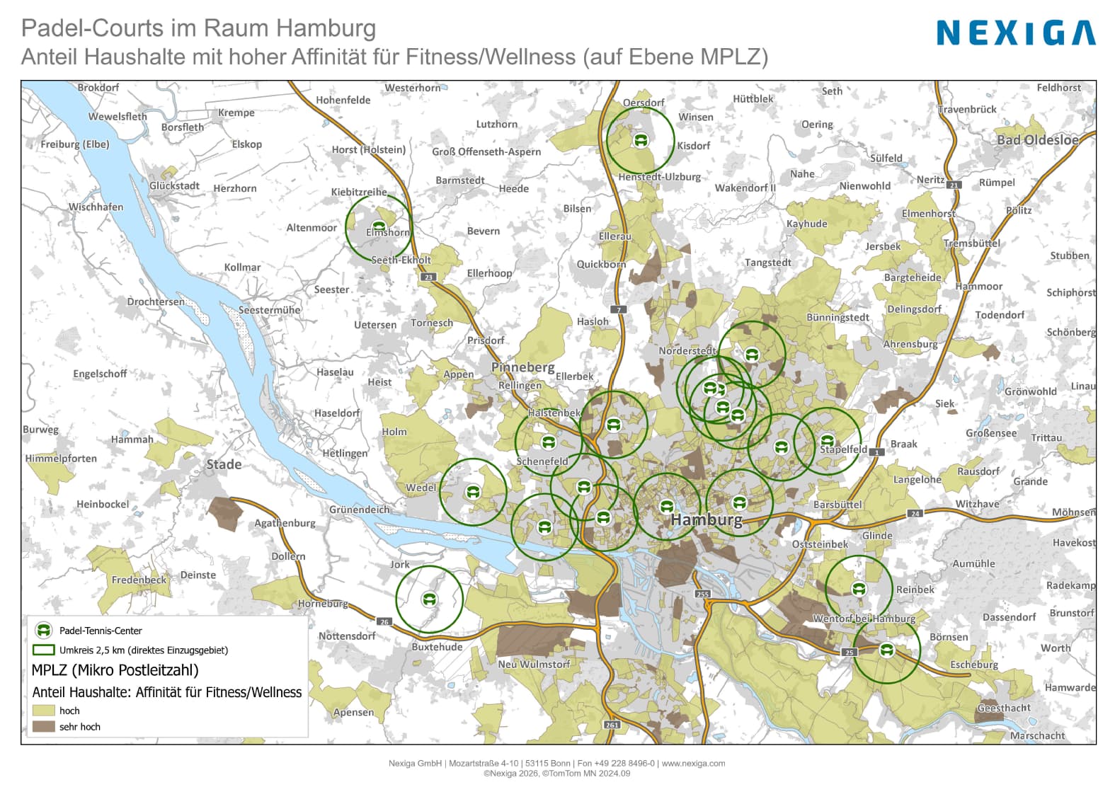 Unsere Karte (PDF) zeigt die aktuelle Verteilung der Padel-Tennis-Anlagen in und um Hamburg. Ergänzend werden die Einzugsgebiete der Courts dargestellt sowie auf Ebene feinräumiger MikroPLZ (MPLZ) jene Nachbarschaften hervorgehoben, in denen der Anteil an Haushalten mit einer hohen Affinität zu Fitness- und Wellnessangeboten besonders groß ist. Diese Gebiete weisen ein überdurchschnittliches Zielgruppenpotenzial für Padel-Tennis auf.